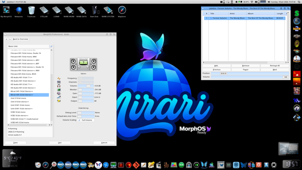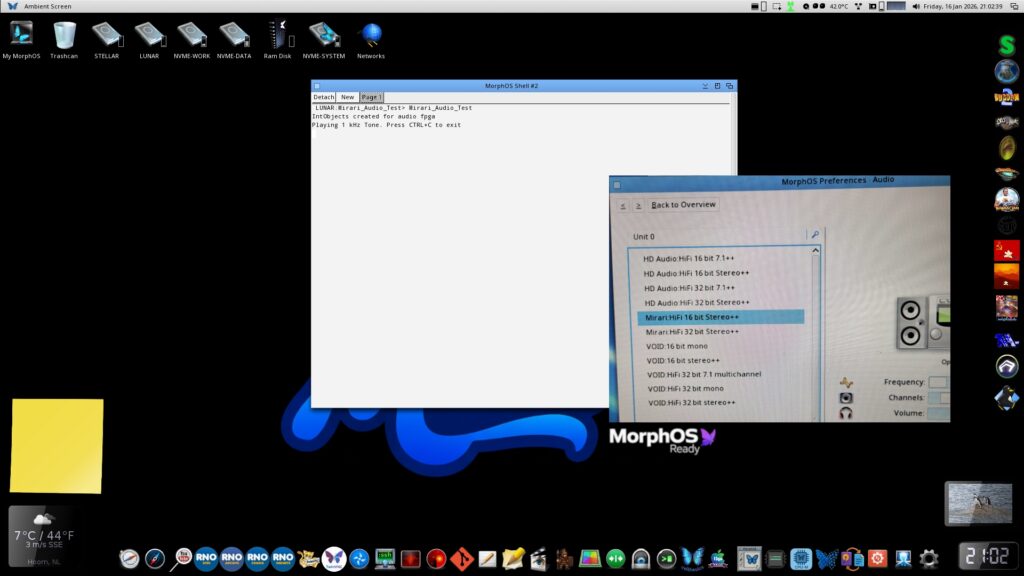 Jan 18 2026,..The first version of the onboard audio driver has been finalized and compiled by Harald. This means there is no need for an additional soundcard in the Mirari mainboard anymore to have sound when using the MorphOS operating system. Another big step forward.