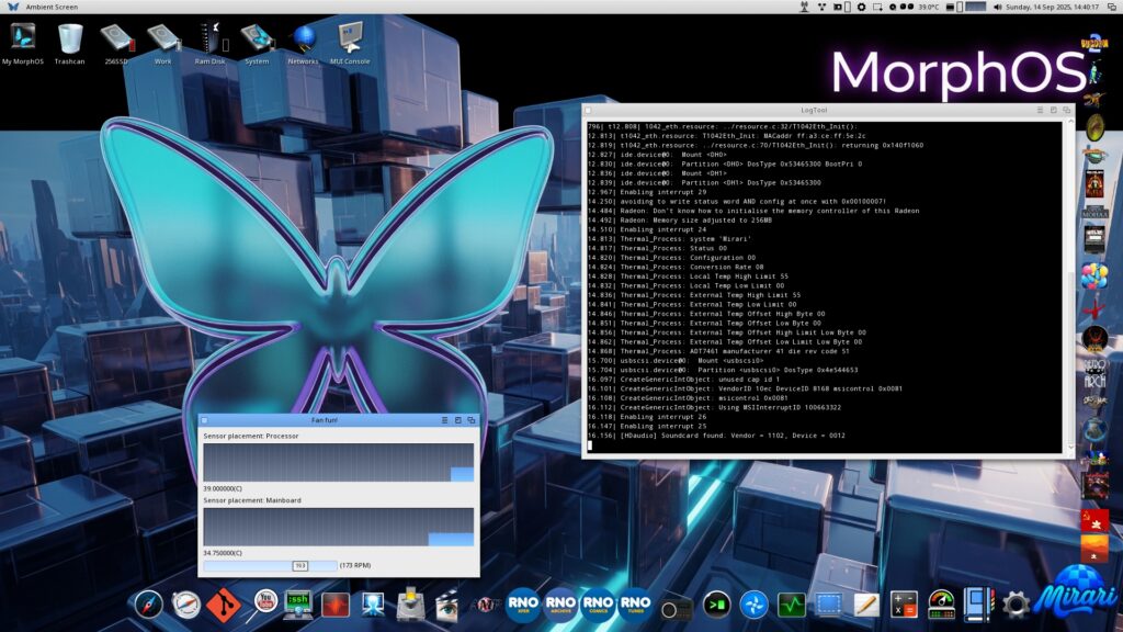 Since a few days it is possible to control the fanspeed withing MorphOS. Frank Mariak has adjusted some code originally written by “Jaca” for the Powerbook to read and operate the sensors controlling the temprature and fan speed. Great work by Frank and Harald for placing sensors on the board and his FPGA Microcode..
