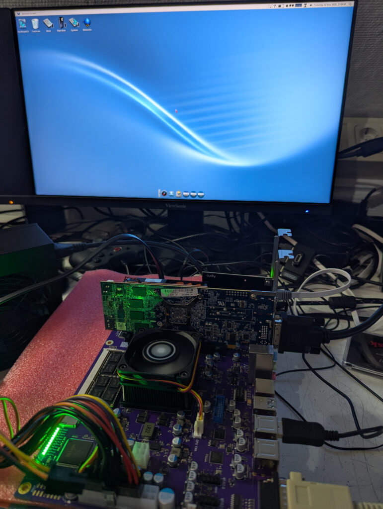 March, 9 2025 As the board is running fine there still was one issue that needed some attention. Cards placed in the PCIx1 slot did not get detected. Harald had a hard time solving the issue…but as always.. he succeeded. We needed two small resistors to be soldered onto the Mirari`s PCIx1 slot. Marco did a great Job soldering the components and making sure we have a working PCIx1 slot now!