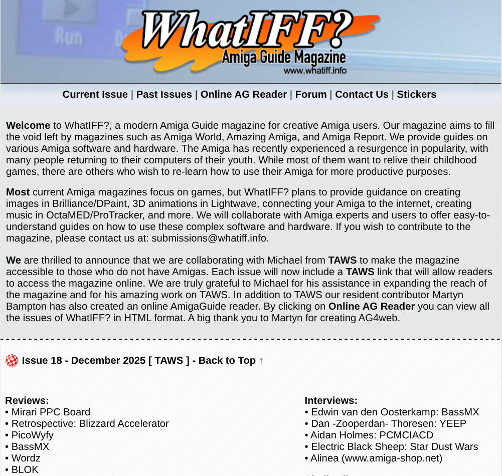 Welcome to WhatIFF?, a modern Amiga Guide magazine for creative Amiga users. Our magazine aims to fill the void left by magazines such as Amiga World, Amazing Amiga, and Amiga Report. We provide guides on various Amiga software and hardware. The Amiga has recently experienced a resurgence in popularity, with many people returning to their computers of their youth. While most of them want to relive their childhood games, there are others who wish to re-learn how to use their Amiga for more productive purposes. Check it out ! TAWS