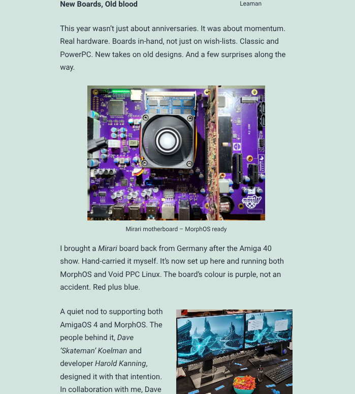 As always great to read…Trevors Blog with latest Amiga news. Also this time some Mirari and MorphOS love. Check the link to read more.. http://blog.a-eon.biz/blog/index.php/2025/12/22/forty-fever/